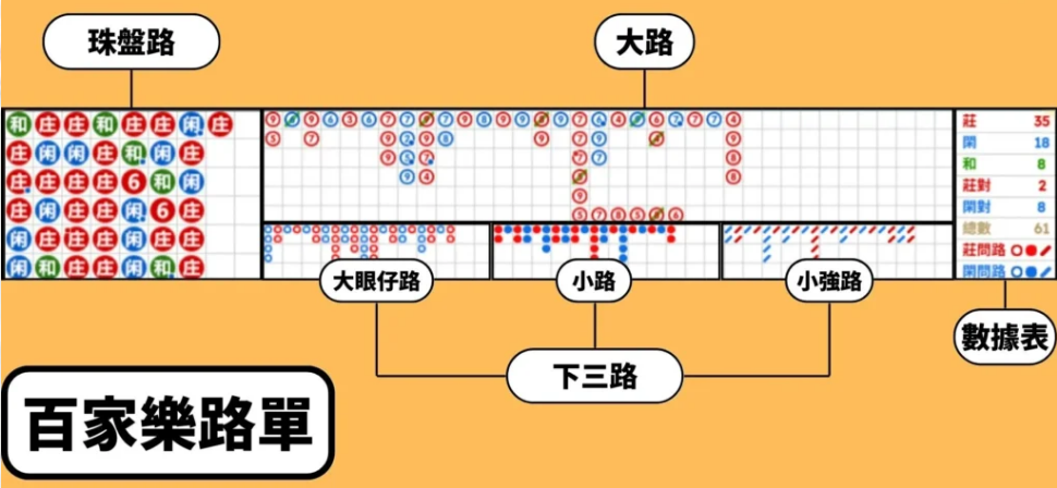 牌路是百家樂的觀察重點,包括「大路」、「小路」、「大眼仔」、「蟑螂路」等。透過觀察路圖形態來判斷接下來可能是莊、閒或跳水趨勢。