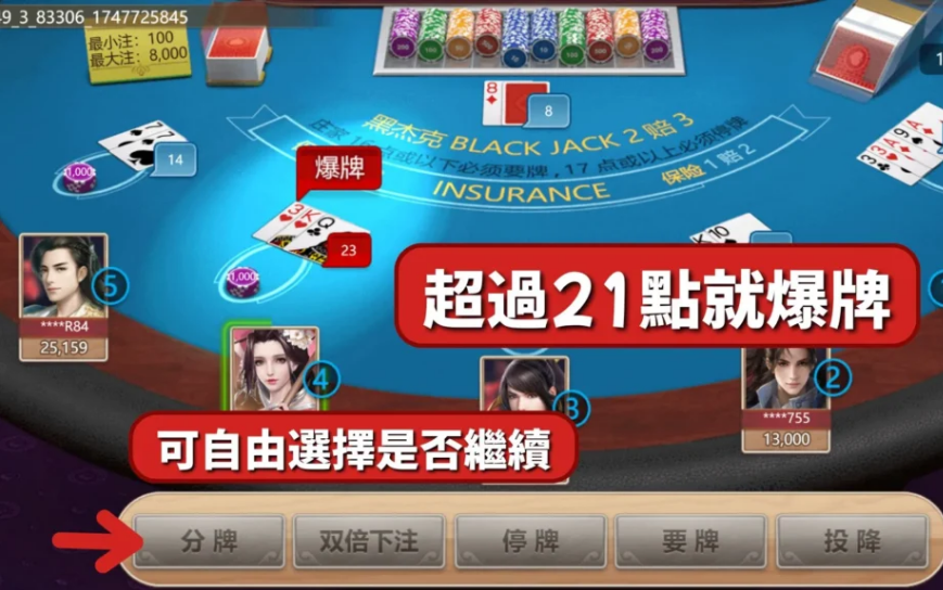 | 爆牌定義 | 若總點數超過21點即為爆牌,該局視為直接失敗 |