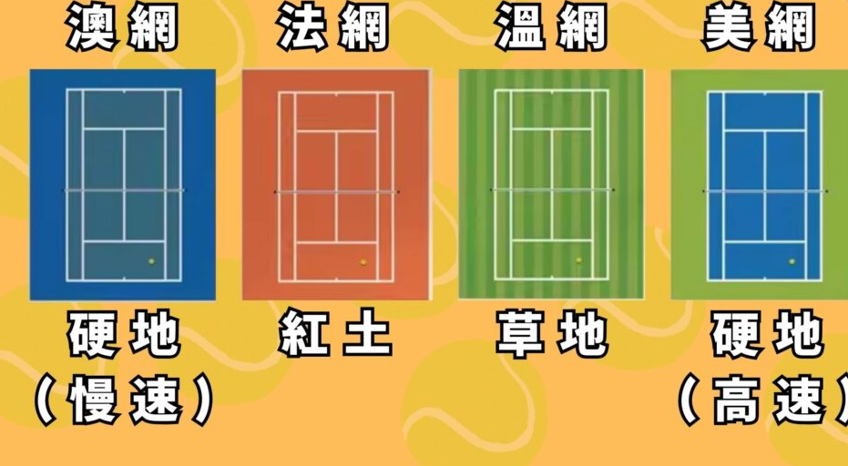 澳網 & 美網:硬地,速度快,球路直;法網:紅土,慢速但彈跳高,強調耐力;溫網:草地,速度最快,彈跳不規則,技術門檻高
