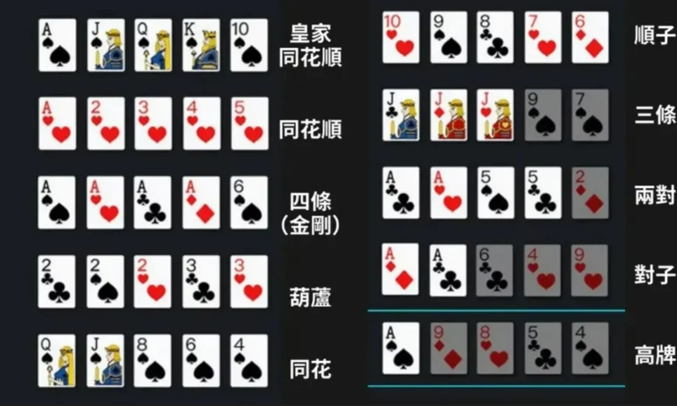 | 皇家同花順 | A-K-Q-J-10同花 | ♥A♥K♥Q♥J♥10 |
